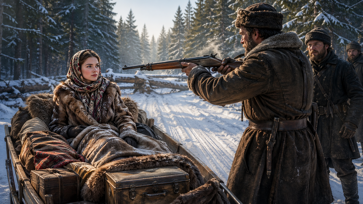 Она сидела на санях, в собольей шубе, завёрнутая в шкуру. Не встала. Не закричала. Только повернула голову и посмотрела в сторону главаря — того, с длинной бородой, — который уже шёл к её подводе, держа винтовку у плеча.