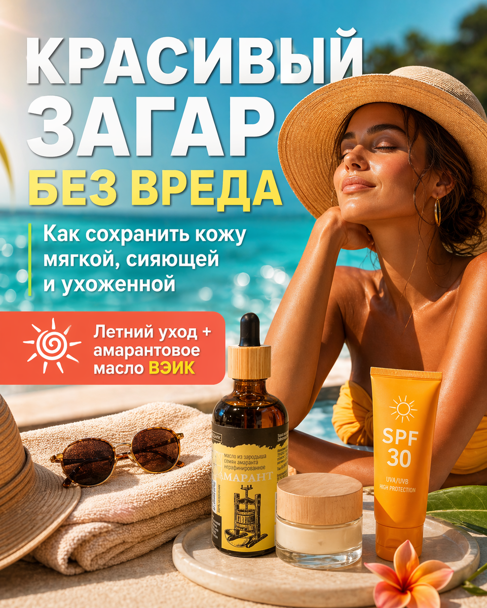 Мы в ВЭИК уверены: красивый летний загар — это не история про героизм. Это история про уважение к коже. Сначала солнцезащитное средство и разумное солнце, потом — мягкий уход, который помогает коже чувствовать себя комфортнее. В этой схеме амарантовое масло ВЭИК может быть хорошим элементом вечернего ритуала или ухода после душа, но не заменой защите от солнца.