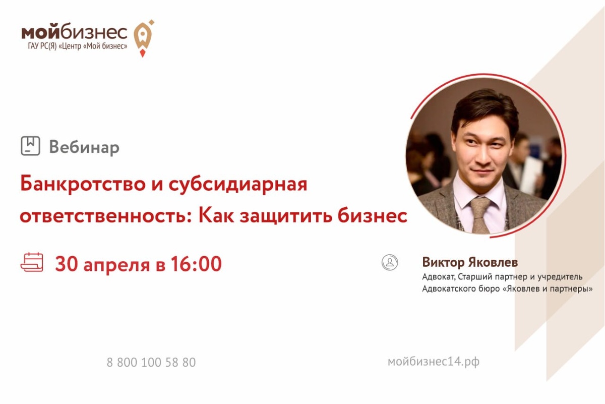 Защита участников бизнес-сообщества от субсидиарной ответственности». На вебинаре вы узнаете о том, в каких случаях наступает субсидиарная ответственность, кто может быть привлечён к ответственности и как выстроить защиту и минимизировать риски для бизнеса и личного имущества. Кроме того, получите практические советы от эксперта. ✔️В программе: • Субсидиарная ответственность в банкротстве. • Практика и отношение судов к лицам, подлежащим субсидиарной ответственности. • Типичные ошибки и способы исключения рисков. • Примеры реальных дел. • Вопросы и ответы. 📆Дата: 30 апреля ⏰Время: 16.00 🎙Спикер: Виктор Яковлев, Адвокат, Старший партнер и учредитель Адвокатского бюро «Яковлев и партнеры», Председатель комиссии по геологии и недропользованию Якутского Регионального отделения «ОПОРА РОССИИ», Член Ассоциации юристов России. 🔗Регистрация по ссылке: https://forms.yandex.ru/cloud/69e888d69029023d24f544b4 Развивайте бизнес с нами! 📲Напоминаем, что канал Центра "Мой бизнес" запущен