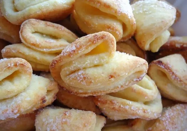 Помните его! Многие уже забыли, но в советском детстве такое печенье продавали в магазинах. Не везде, но оно было и многие мамы пытались повторить рецепт. Нашла самый похожий как ни странно, в польской кухне. Там это печенье называется "французским". Вот вам и советское))) Оказывается нет. • 200 гр. замороженного сливочного масла (либо 150 гр. маргарина для выпечки) • 200 гр. творога (0-2%) • 2 стакана муки • 2 яичных желтка • 2 столовые ложки холодной воды • 120 гр. сахара (в тесто только 1 ложка, все остальное для обсыпки) 1. Заморозьте сливочное масло как минимум на 1 час. Посыпьте разделочную доску мукой. Крупно натрите замороженное масло на терке и выложите на муку.