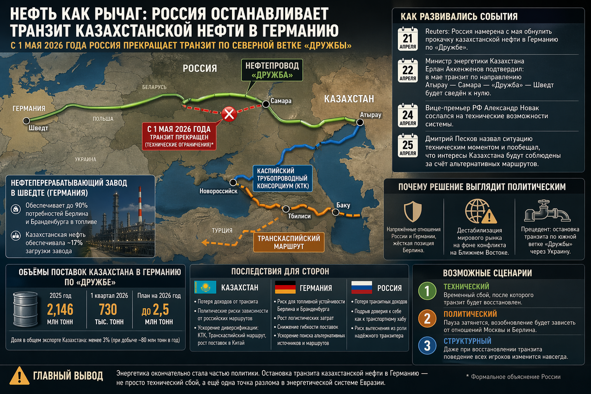 С 1 мая 2026 года Россия останавливает транзит казахстанской нефти в Германию по северной ветке нефтепровода «Дружба». Формально решение объясняется техническими ограничениями трубопроводной системы. Однако сама логика событий, заявления сторон и общий политический фон показывают, что речь идет не просто о производственном эпизоде. На наших глазах энергетическая инфраструктура Евразии всё откровеннее превращается в инструмент политического давления, а любой сбой или остановка немедленно начинает влиять не только на рынок, но и на отношения между государствами.