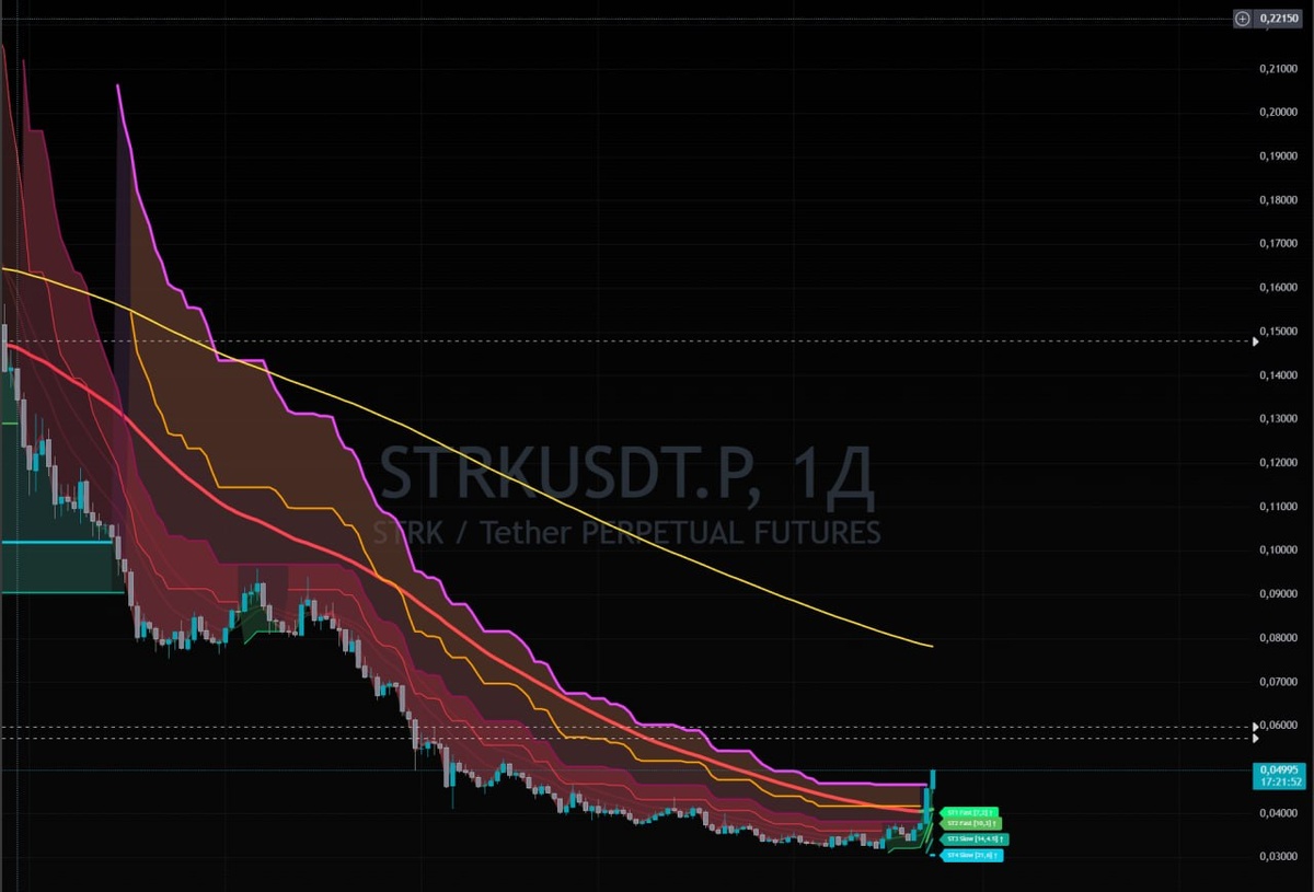 Наконец-таки STRK делает хоть первую попытку слома нисходящего тренда начиная с ноября 2025года. В данный момент пробили уже 60ый нан дневке, и сейчас пытается пробить ST4 (дневной тренд). В случае закрепа выше 0.05, это уже будет хорошо. Снизу поддержка +-0.04$