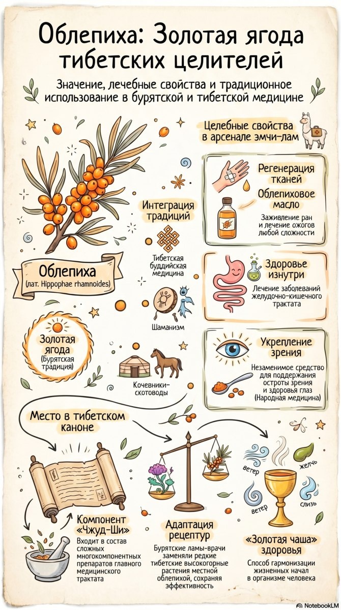 Hippophae rhamnoides — поливитаминное растение, известное в тибетской медицине тысячелетиями. Древнейшие упоминания о лечебных свойствах облепихи содержатся в тибетских трактатах IX в. до н.э. Бурятские ламы-врачи успешно заменяли редкие тибетские высокогорные растения местной облепихой, сохраняя эффективность рецептур трактата «Чжуд-Ши». Облепиховое масло — единственное растительное масло, содержащее все четыре омега-кислоты (3, 6, 7 и 9). Содержит более 190 биологически активных веществ, каротиноиды, витамины A, C, E, K. Официально зарегистрировано как лекарственное средство, применяется в гастроэнтерологии, дерматологии и гинекологии. Впервые масштабно исследовано в СССР при подготовке к космическим полётам. 📖 Источники: Карцева И.А. // Cyberleninka «Облепиха — лечебное средство»; Wikipedia «Облепиха крушиновидная»; ВОЗ