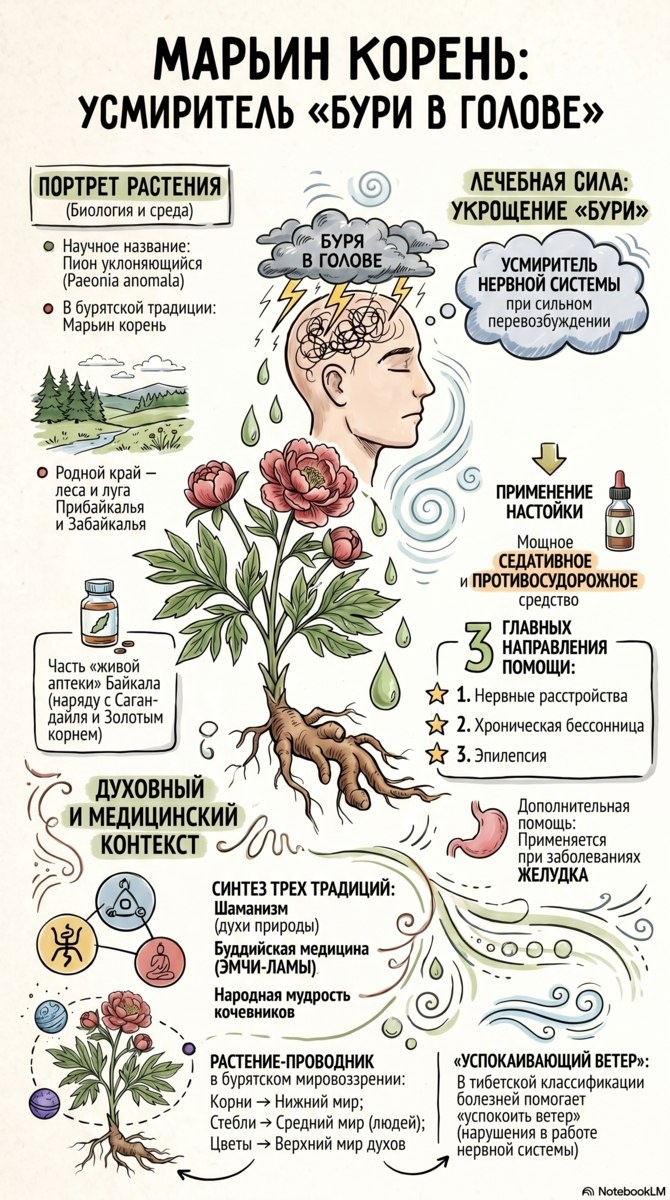 Пион уклоняющийся (Paeonia anomala) — многолетник лесов и лугов Прибайкалья. В бурятской традиции «марьин корень» занимает одно из центральных мест «зелёной аптеки» Байкала, объединяя шаманизм, буддийскую медицину и опыт кочевников. Фармакологические свойства официально подтверждены: настойка 1:10 на 40% спирте оказывает выраженный седативный и противосудорожный эффект при неврастении, бессоннице и эпилепсии. В тибетской медицине применялся при болезнях почек, гипертонии, желудочно-кишечных расстройствах и как абортивное средство. Ключевые вещества: эфирное масло с метилсалицилатом, гликозид салицин, флавоноиды, танины. 📖 Источники: Турова А.Д. «Лекарственные растения СССР» (1974); u-lekar.ru; Государственная фармакопея РФ