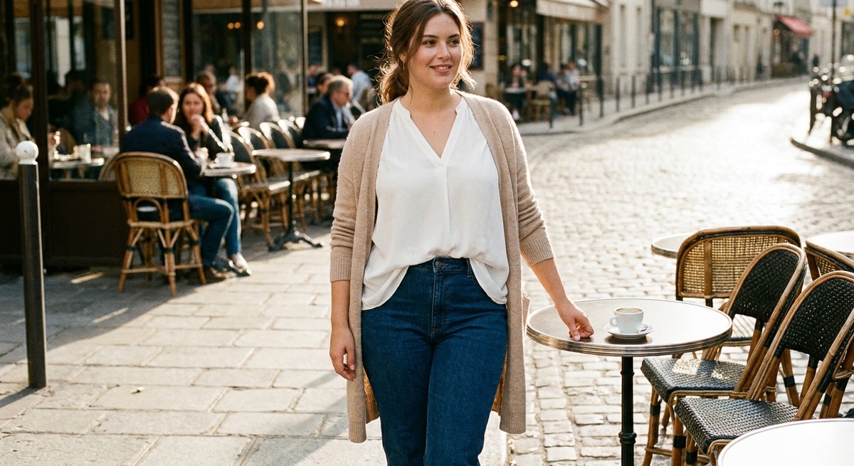 Вертикальные линии станут вашими лучшими друзьями. Длинные кардиганы, жакеты прямого кроя, удлинённые блузки создают визуальное вытягивание силуэта. Особенно эффективны вещи с V-образным вырезом — они зрительно удлиняют шею и открывают зону декольте, отвлекая внимание от талии.