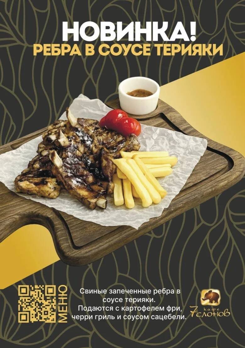 Новинка в кафе @https://vk.com/7slonovcafe (7 Слонов) 🔥 Друзья ! По вашим просьбам мы добавили в меню : Сочные свиные ребра в соусе терияки 🍖 Подаются с картофелем фри , черри гриль и соусом сацебели . 🤩 Спешите попробовать 🔥 👍 Скачайте наша приложение , копите бонусные баллы и оплачивайте ими до 29% от суммы счета : foodpicasso.com/x/2465x1e0 ул .Большая Советская 19/2 Бронь столиков ☎ 606-777 Ждём Вас ❤ 2VtzqwB2DVv