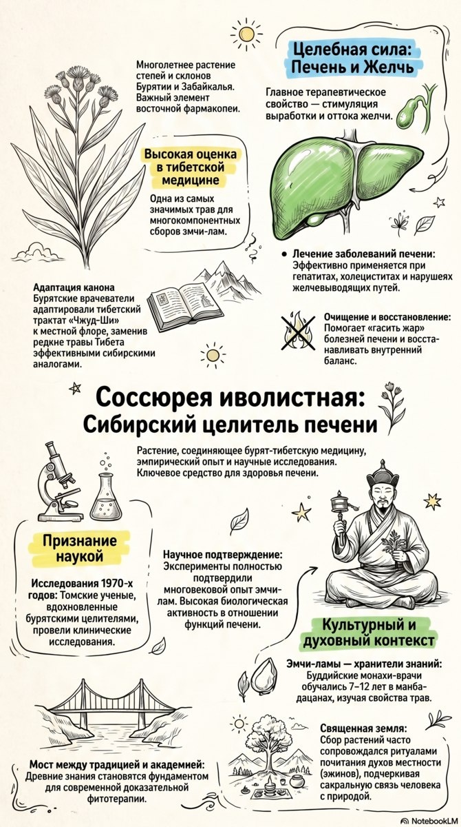 » Saussurea salicifolia — многолетник степей и горных лугов Забайкалья и Сибири, важный элемент восточной фармакопеи. В народе её ласково называют «голубушкой» и «горькушей» — за характерную горечь, которая и определяет главные лечебные свойства. Трава содержит алкалоиды, дубильные вещества, эфирные масла, органические кислоты и богатый набор микроэлементов (кальций, магний, железо, кобальт, цинк). Водный настой применяется при болезнях печени и желчного пузыря, улучшает выработку желчи, оказывает мощное очищающее действие. Научно доказана противопаразитарная и противоопухолевая активность. В 1970-х томские учёные, вдохновлённые бурятскими целителями, провели клинические исследования, подтвердившие многовековой опыт эмчи-лам. Бурятские врачи-ламы использовали соссюрею как сибирский аналог редких тибетских трав «Чжуд-Ши». 📖 Источники: lektrava.ru «Соссюрея иволистная»; Асеева Т.А. «Тибетская медицина» (Улан-Удэ, 1991); altailife.ru