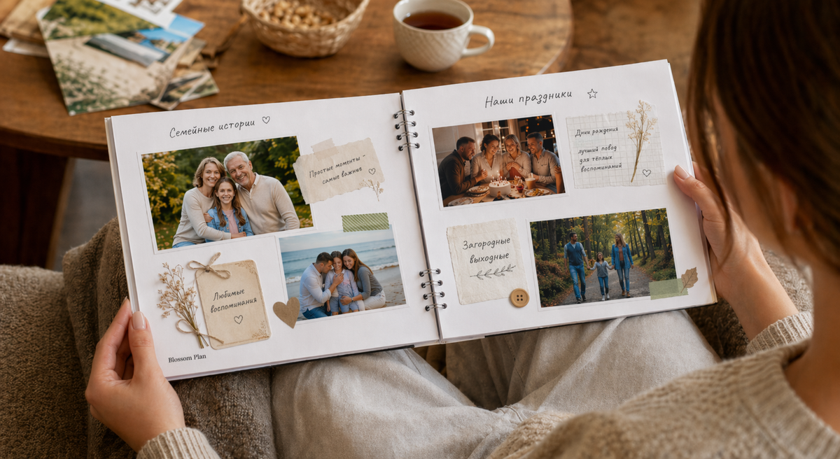 Елена на связи, редактор Blossom Plan. Сегодня поговорим о том, как сделать фотоальбом для родителей — быстро, просто и без лишнего перфекционизма. Вы знаете, что самое ценное для родителей? Это не дорогие подарки, а ваше внимание. Фотоальбом, наполненный историей, может стать таким подарком. Но часто мы откладываем его создание, потому что кажется: нужно много времени, материалов и идеального настроения. Давайте упростим. Альбом — это не просто набор фотографий. Это повествование. Решите, о чем он: о вашем детстве? О совместных путешествиях? О том, как ваши родители познакомились? Определитесь с темой — так проще отбирать снимки и выстраивать композицию. Не гонитесь за количеством. Лучше меньше, но ярче. Что работает: - Хронология (от прошлого к настоящему) - Тематические блоки («Наши праздники», «Загородные выходные») - Смешанный формат — когда важны не даты, а эмоции Не надо бежать в магазин за специальной бумагой или дорогим декором. - Старые журналы — вырежьте буквы для заголовков