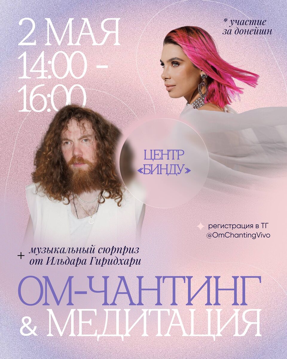 : 🪷14:00-16:00 Ом-Чантинг и медитация со мной и Ильдаром Гиридхари в Бинду (donation) 🪷16:00-18:00 Йога FYSM с Марго и Тимом + Гонг в Бинду (от 2000₽) 🪷19:00-21:00 Ильдар Гиридхари и Суффикс в Белых Облаках (от 1050₽) Приглашаю провести этот день в месте, как такой ретрит-перезагрузку в приятном общении (На каждое событие необходимо регистрироваться отдельно)