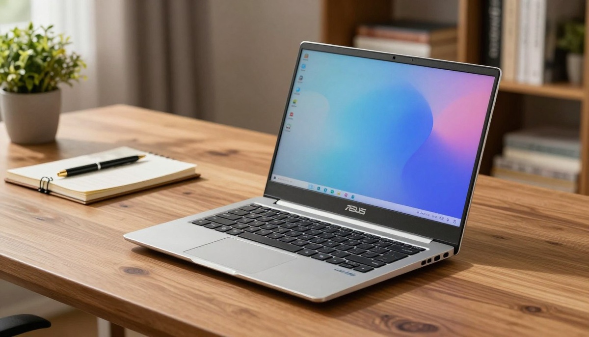 A sleek ASUS Vivobook 15 M1502NAQ laptop showcased on a polished wooden desk in a modern office environment. The laptop is open, displaying a vibrant screen with a clear view of a colorful desktop background. The exterior features a stylish metallic finish, showcasing its slim profile and elegant design. Soft, natural light filters through a nearby window, creating a warm and inviting atmosphere. In the foreground, there's a minimalist notebook and a stylish pen, adding to the professional setting. The angle captures both the laptop’s keyboard and screen while emphasizing its ergonomics and aesthetic appeal. The overall mood is contemporary, highlighting innovation and functionality in design.