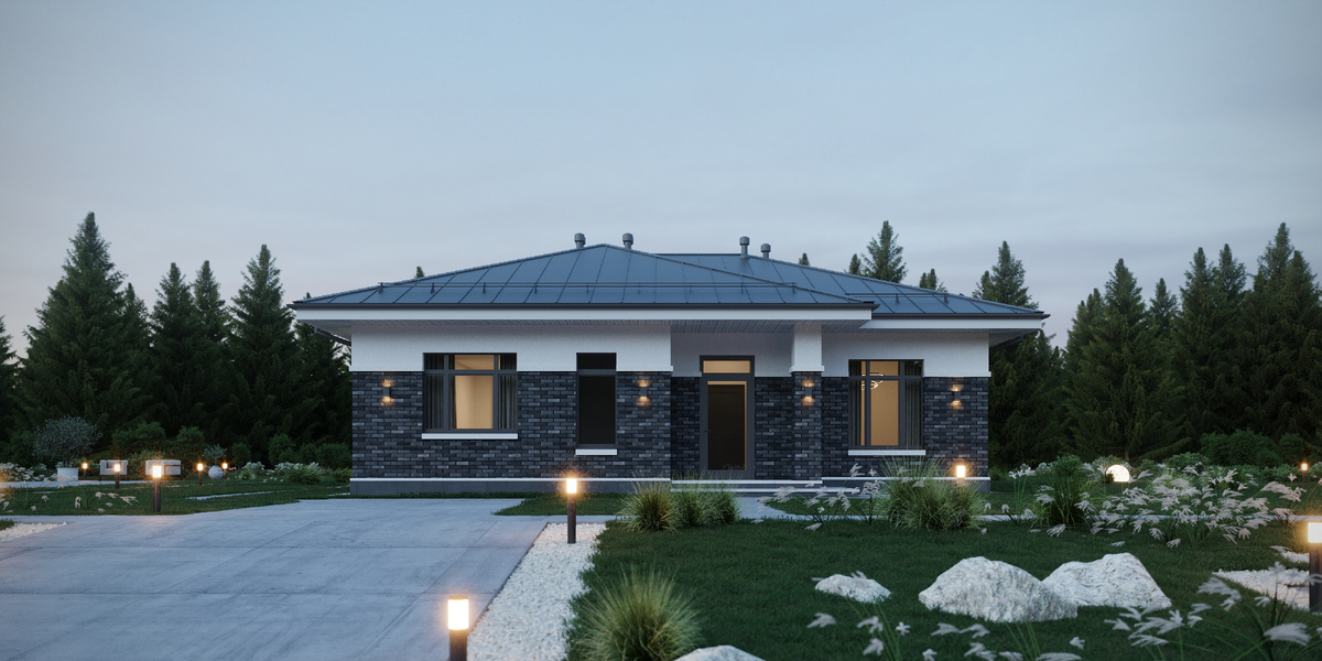 Этот проект мы реализовывали уже не один раз. За время работы появлялись разные варианты: меняли облицовку фасада, корректировали планировку под задачи конкретных заказчиков, адаптировали детали под участки. При этом сам дом остается востребованным — за счет удачной планировки и понятного внешнего решения. Пространство в доме разделено на общую зону и приватные комнаты, при этом все помещения связаны между собой без лишних переходов: от входа через прихожую и холл можно быстро попасть в любую жилую часть. Центром дома становится гостиная-столовая 27,3 м² с выходом на террасу, рядом расположена кухня 11,7 м², которую можно объединить с общей зоной или оставить отдельной. В приватной части — три спальни разного размера, гардеробная и два санузла. При необходимости можем изменить планировку, размеры помещений и отдельные элементы под ваш сценарий жизни. Также подобрать фасадное решение под ваши предпочтения и бюджет. (3452) 39-65-71