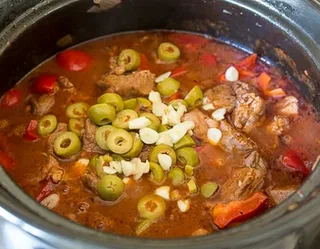 - За 15–20 минут до окончания тушения в сковороду добавить нарезанный полосками перец, колечки оливок и мелко порубленный чеснок.