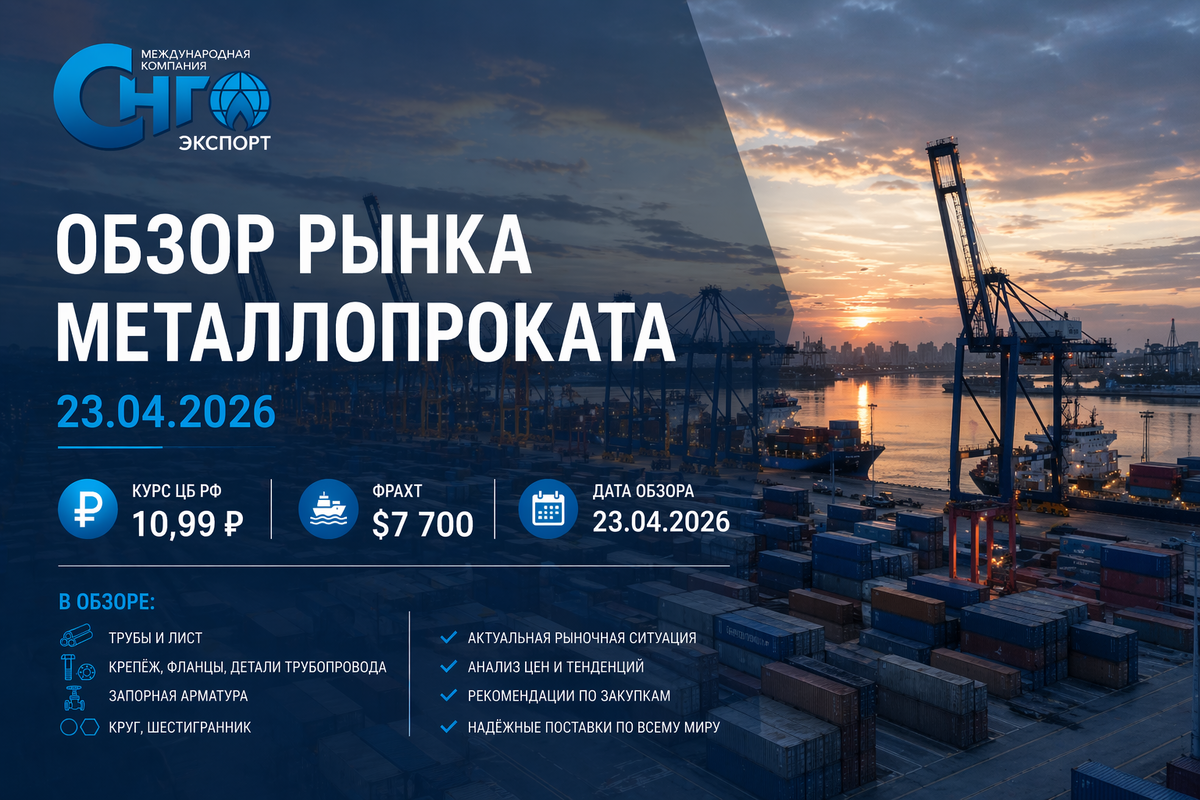Аналитика рынка металлов Приветствуем! В МК СНГ-Экспорт мы анализируем ситуацию на рынке импортного металлопроката (трубы, листы, круг, шестигранник, крепёж, детали трубопровода, запорная арматура, фланцы), чтобы помочь вам принимать взвешенные решения. Сегодня, 23.04.2026, обстановка следующая. Курс CNY/RUB: Официальный курс китайского юаня, установленный ЦБ РФ на сегодня, составляет 10,9931 рубля. За прошедшую неделю юань вырос на 5 копеек. Колебания незначительные, курс стабилен. Фрахт из Китая: Здесь ситуация более напряжённая. Стоимость доставки заметно выросла: перевозка 40-футового контейнера из Шанхая в Москву подорожала на ~15% с конца февраля, достигнув $7 700. Стоимость морских перевозок из стран Азии на Дальний Восток выросла на 18,5%. Спрос в РФ: С началом строительного сезона спрос заметно активизировался по сравнению с провальными зимними месяцами. Индекс цен металлоторговли в Центральном регионе РФ вырос. 🔩 Импортный прокат (трубы, листы, круг, шестигранник)