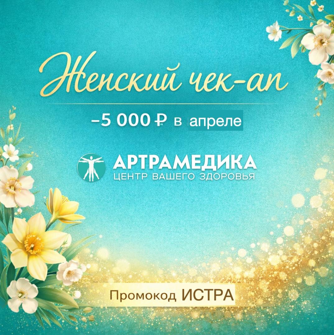 Расширенный женский чекапв «АРТРАМЕДИКЕ» — 20 500 ₽ вместо 25 500 ₽ Экономия 5 000 ₽ по промокоду «Истра»только с 1 по 30 апреля Мы собрали расширенный чекап так, чтобы вы прошли всё в одном месте — спокойно и последовательно. 🔎 Что входит: 👩⚕️ Консультации врача— первичный приём акушера-гинеколога— повторная консультация по результатам 🧪 Лабораторная диагностикаПАП-тест (жидкостная цитология), ВПЧ-тест (21 тип, количественный), клинический анализ крови с лейкоформулой и СОЭ, общий анализ мочи, биохимический анализ крови, ферритин, флороценоз 🧬 Гормональный профильТТГ, Т4 свободный, пролактин, ЛГ, ФСГ, АМГ 🖥 УЗИ органов малого таза(трансвагинально и трансабдоминально) ✔ Взятие биоматериала включено Вы проходите всё без лишних визитов и получаете понятный разбор результатов. Скидки не суммируются. Количество мест ограничено. Мы в МАХ https://max.ru/id5017139850_biz АРТРАМЕДИКА, Истра, ул. Рябкина, 41 +7 (977) 000-71-81 https://artramedica.ru/zhenskiy-chekap-istra-artramedika 18+