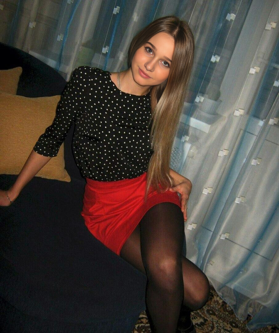 Поза девушки расслабленная: она слегка наклонилась вбок, одна рука опирается на диван, другая — на бедро. Выражение лица спокойное, с лёгкой улыбкой.