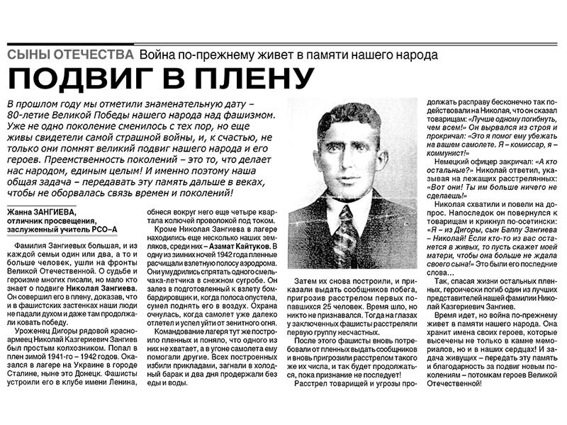 Напомним, мартовская статья была посвящена описанию подвига уроженца Дигоры красноармейца Николая Казгериевича Зангиева, совершенного им в немецком плену. Он участвовал в осуществлении побега своего пленного товарища-летчика на немецком самолете, а затем взял на себя всю вину, чтобы спасти от пыток и расстрела других заключенных.