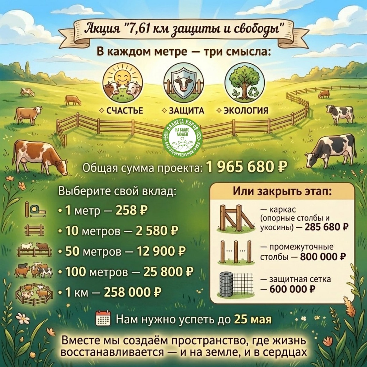 » Помогите создать пространство, где 120 счастливых коров будут жить свободно и в безопасности. ❗️Друзья, у нас есть всего 30 дней, чтобы сделать это. Мы запускаем акцию: «7,61 км защиты и свободы» Наша цель: До 25 мая построить надёжное ограждение для 140 гектаров пастбищ. 🐮 Чтобы уже в конце мая 120 коров и быков, вышли на свободный выпас в готовое ротационное пастбище. Это ограждение прослужит не менее 10 лет. Почему это больше, чем забор? В каждом метре — три смысла: 🔸 СЧАСТЬЕ: Свободный выпас, движение, солнце - это то, что делает их жизнь по-настоящему качественной. Естественная жизнь коров и быков. 🔸 ЗАЩИТА: Ограждение снижает внешние риски и делает территорию безопасной. Это их личная "крепость" под открытым небом. Особенно важно сейчас — на фоне вспышек инфекций среди животных. 🔸 ЭКОЛОГИЯ: Ротационный выпас восстанавливает землю: — трава отрастает заново — почва не истощается — возвращается биоразнообразие ✨ Каждый метр — это жизнь, защита и восстановление земли