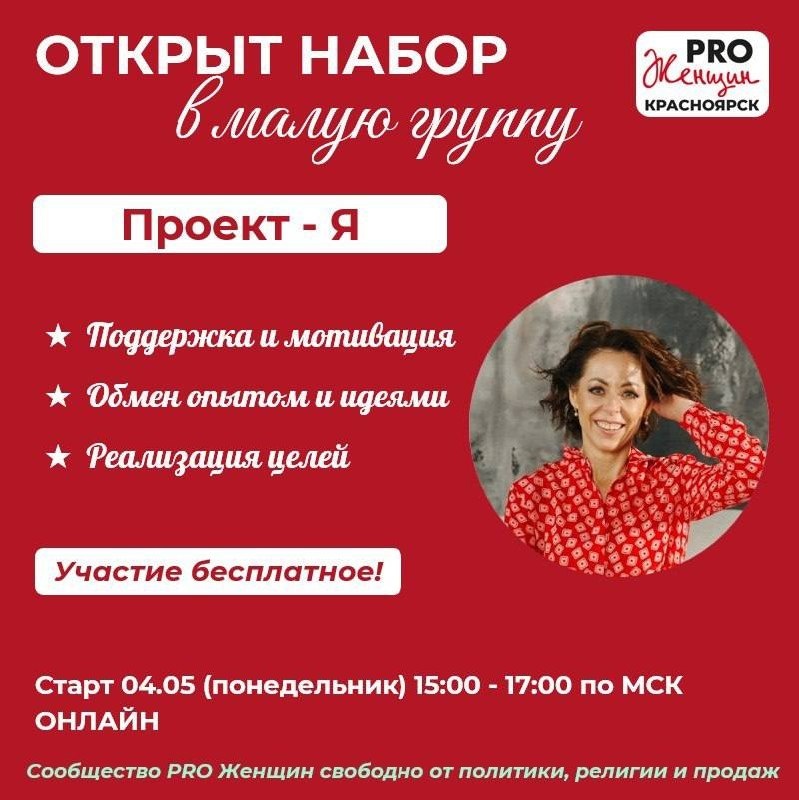 » Дорогие женщины! Приглашаю вас в группу, где ваши идеи станут реальными шагами, а цели — достижимыми. Эта группа для вас, если вы: 🤑 запускаете новый проект, но откладываете важные шаги 🤑 хотите получать живую поддержку и обратную связь 🤑 готовы делать конкретные шаги к своей бизнес-цели 🤑 мечтаете зарядиться энергией и мотивацией для роста Группа для участниц из любого города мира 🌍 Что вас ждёт: 🤭 Постановка цели и разбор реальных шагов 🤭 Безопасное пространство, где можно быть собой 🤭 Живой обмен опытом и взаимная поддержка 🤭 Рефлексия и обратная связь 🤭 Ресурс, чтобы наконец начать делать то, что давно хотели ФОРМАТ: 😗 старт 04 мая (понедельник) 😶 время 15:00-17:00 по МСК 😟 ОНЛАЙН в Яндекс.Телемост (без записи встреч) 😘 8 встреч (1 раз по понедельникам) Условия участия: 1️⃣ Зарегистрироваться в сообществе PRO Женщин ❤️ https://pro-women.org/ 2️⃣ Зарегистрироваться в моей группе ❤️ https://pro-women.org/groups/152525/ 3️⃣Нельзя пропускать более 2-х встреч (ин