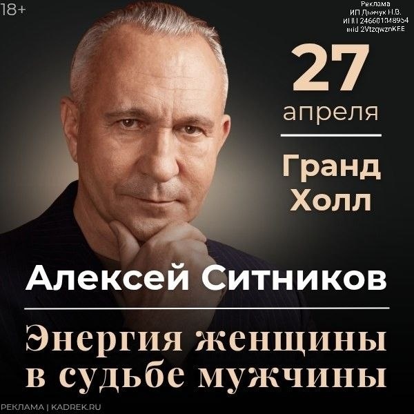 Сценарии. Выборы. Люди. Меняются детали, но суть остаётся той же. И в какой-то момент становится интересно не «почему так происходит», а что с этим вообще можно сделать. 27 апреля в Красноярске пройдёт грандиозное событие – единственная живая лекция Алексея Ситникова @drSit Тема лекции: «Энергия женщины в судьбе мужчины» Это возможность посмотреть на привычные вещи под новым углом, получить ощущение опоры и ясности. Зарядиться энергией. А энергия сейчас – это самая ценная валюта. Поговорим о том: • почему повторяются одни и те же сценарии • что нужно, чтобы отношения были опорой, а не источником проблем • как выстраивать гармоничные, счастливые отношения • откуда берутся те самые «ошибки выбора» • как встретить своего человека и построить гармоничный союз; • как родовые программы влияют на отношения и судьбу; • как воспитывать детей, чтобы они выросли счастливыми и уверенными в себе. [ ПРОГРАММА ПОЛНОСТЬЮ ] 📌 Когда: 27 апреля Где: Гранд Холл Сибирь 🎟️ КУПИТЬ БИЛЕТ Afisha.yan