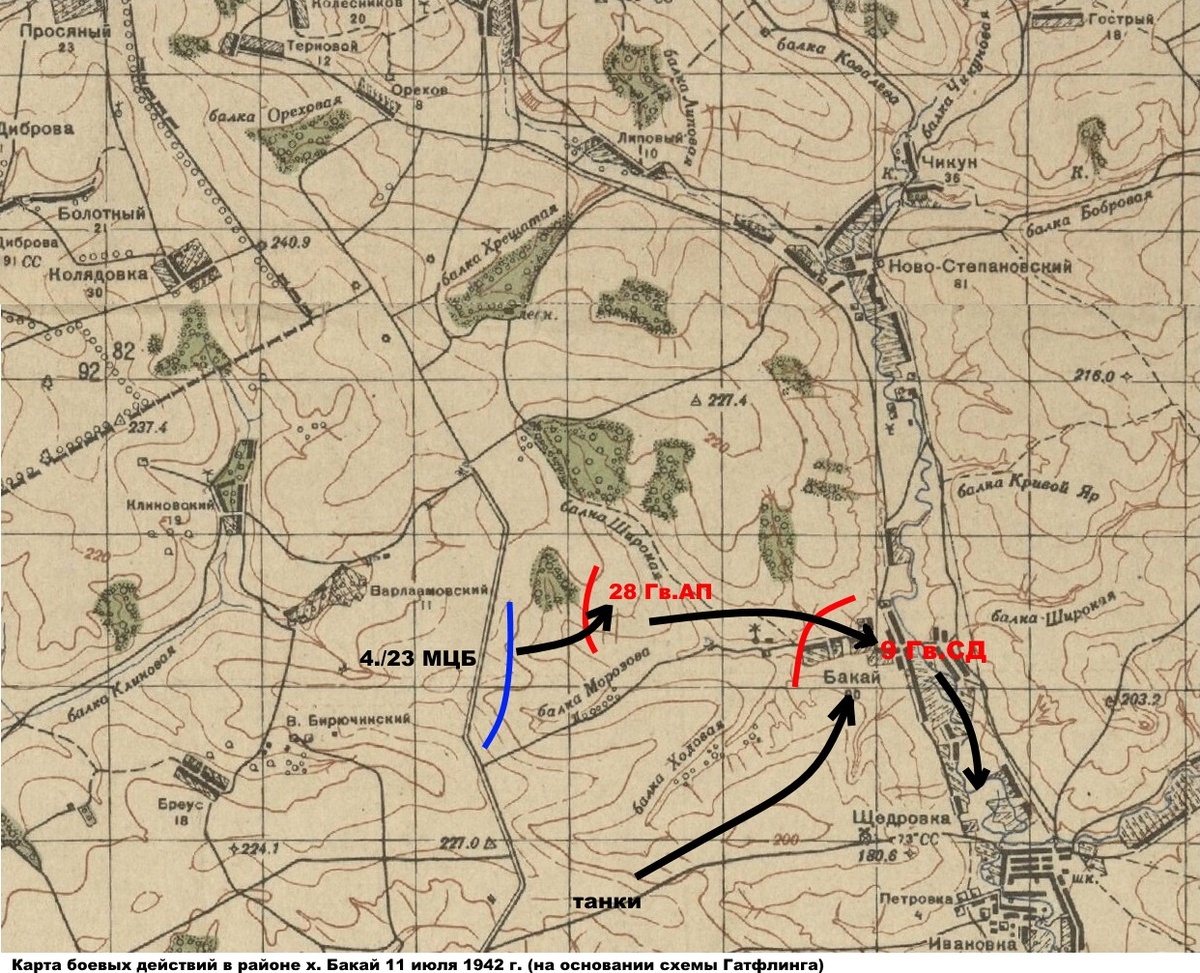В журнале боевых действий штаба артиллерии 9-й Гв.СД, впрочем, говорится, что после того как танки подавили противотанковую оборону, «группы автоматчиков на мотоциклах под прикрытием интенсивного минометного и артиллерийского огня быстро стали продвигаться в Бакай», после чего собственно и начался отход штаба 9-й Гв.СД и других частей из Бакая [5, л. 16]. По сути то же самое описывается и в отчете командира 4-й мотоциклетной роты обер-лейтенанта Гатфлинга. Согласно этому отчету, преследуя беспорядочно отступавших бойцов 9-й Гв.СД, 1-й взвод 4-й роты на мотоциклах ворвался в Бакай и быстро достиг его юго-восточной окраины, по дороге пленив много отступавших советских солдат, а также захватив несколько грузовиков и тракторов с орудиями. По приказу ротного пулеметная группа закрепилась на юго-восточной окраине, блокировав остаткам 9-й Гв.СД путь отхода в юго-восточном направлении, причем Гатфлинг приказал пулеметчикам не вести огонь по отходящей на восток пехоте, а стрелять только по отходящим грузовикам и тракторам с орудиями. В результате этого заградительного огня немцам удалось повредить, а затем и захватить к югу от высоты 203,0 еще 2 полевых орудия, которые артиллеристы пытались вывезти из Бакая. Мотоциклисты 1-го взвода тем временем вышли к следующей деревне Щедровка, где были встречены огнем и закрепились на достигнутом рубеже, а вслед затем в 11.00 получили приказ командира роты вернуться обратно в Бакай. В это же время в южную часть Бакая подтянулся также 2-й взвод, а чуть позже подошел и 3-й взвод, который по приказу командира роты организовал сбор и конвоирование пленных [11].