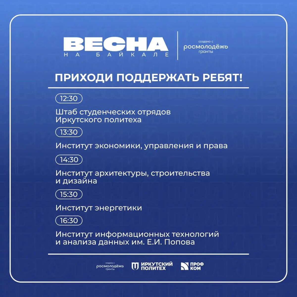 ⭐ С 22 по 24 апреля актовый зал станет точкой притяжения творчества, смелых идей и важных мыслей — не терпится увидеть! Прямой эфир концертных программ | 23 АПРЕЛЯ — Штаб студенческих отрядов — Институт экономики, управления и права — Институт архитектуры, строительства и дизайна — Институт энергетики — Институт информационных технологий и анализа данных им. Е.И. Попова Смотрите расписание в карточке ➡ Концертные программы пройдут в рамках Фестиваля студенческого творчества ИРНИТУ «Весна на Байкале» при поддержке федерального агентства по делам молодёжи Росмолодёжь | Росмолодёжь.Гранты #Росмолодёжь #РосмолодёжьГранты 👻 МАХ | 💙 ВК | 📝 ДЗЕН