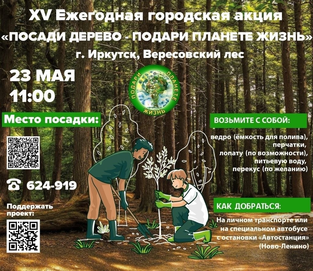 ! Друзья, у нас для вас добрая новость из соседнего Иркутска, которая касается экологии всего Прибайкалья. 23 мая 2026 года в 15-й раз пройдёт городская акция «Посади дерево — подари планете жизнь». Центром событий станет Вересовский лес (микрорайон Вересовка) — особо охраняемая зона в черте города. Организаторы — БФ «Подари планете жизнь» — приглашают восстановить лесной массив, который напрямую влияет на чистоту воздуха. Кто может участвовать? ✅ Индивидуальные добровольцы ✅ Семьи с детьми ✅ Команды от школ, колледжей, бизнеса и НКО Что нужно знать: 📍 Сбор участников — в 11:00 (точную локацию смотрите по ссылке в 2ГИС) 🚌 Для добровольцев организуют трансфер Ново-Ленино — Вересовка — Ново-Ленино (подробности позже) 👕 С собой: ведро, перчатки, лопату (если есть), воду, перекус и отличное настроение Важно для команд от 10 человек: обязательная предварительная регистрация до 15 мая по ссылке. Количество мест ограничено. 💰 Не можете приехать, но хотите помочь лесу? Переведите пож