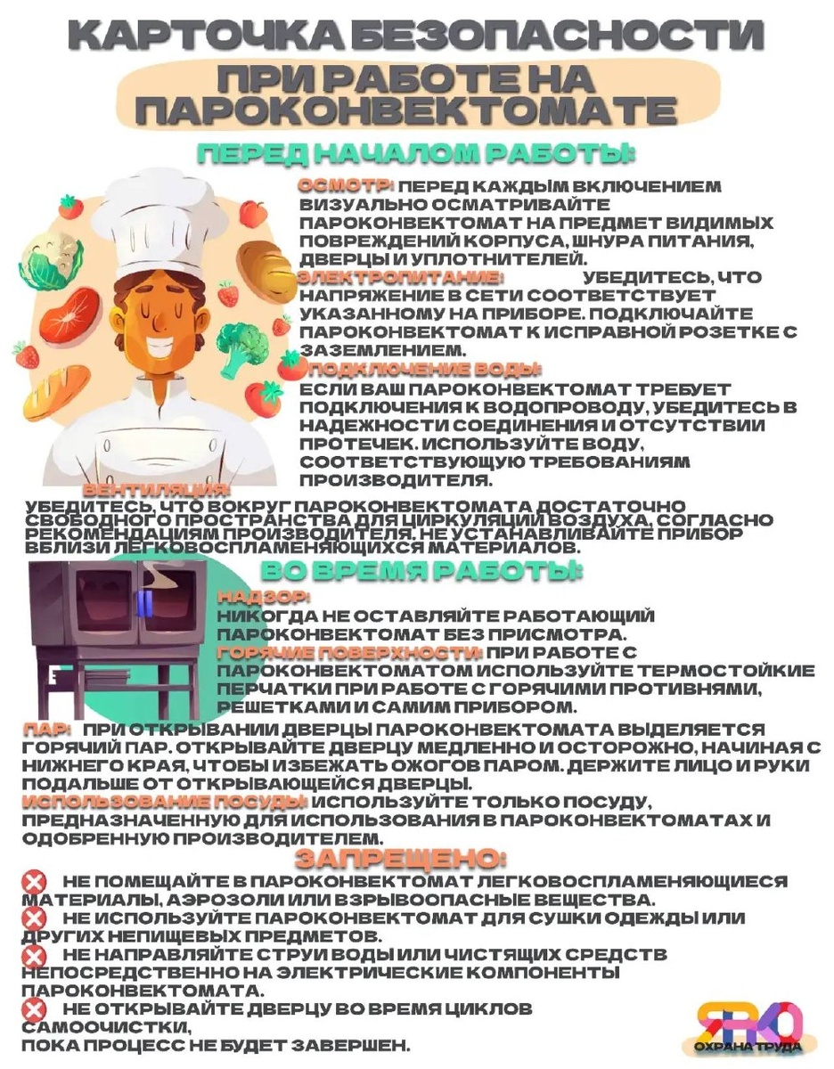 : 🔥ПАРОКОНВЕКТОМАТ 🔍Перед стартом • Осмотрите корпус, кабель, дверцу и уплотнители — без повреждений • Проверьте напряжение и заземление розетки • При подключении к воде убедитесь в герметичности • Обеспечьте вентиляцию и удалите горючие предметы 😐Во время работы • Не оставляйте прибор без присмотра • Используйте термоперчатки — внутри очень горячо • Открывайте дверцу аккуратно: сначала чуть приоткройте снизу для выпуска пара, затем полностью • Держите лицо и руки подальше от пара • Используйте только подходящую посуду ❌Запрещено • Помещать горючее, аэрозоли или опасные вещества • Сушить одежду и непищевые вещи • Лить воду и химию на электрические части • Открывать дверцу во время самоочистки ✨ ЯРКО в Telegram | Max | Дзен