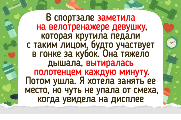 В спортзале часто случаются вещи, к которым не подготовит ни один тренер. Здесь можно полчаса штурмовать чужой шкафчик, случайно выпить воду соседа по тренажеру или обнаружить в своей сумке кота, которого там и в помине быть не должно. Мы собрали 15 историй о людях, для которых обычный поход на тренировку превратился в курьез. Рекомендуем также заглянуть сюда 👇👇👇 В конце концов, спортзал — это не только про гантели, но и про такие вот нелепые моменты, которые потом пересказываешь знакомым. Главное в таких ситуациях — не терять самоиронию и не забывать завязывать шнурки перед тем, как прибавить скорость на дорожке. А какие забавные случаи происходили на тренировках у вас? Превью статьи: