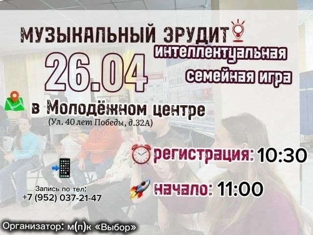 26 апреля в Молодёжном центре состоится интеллектуальная семейная игра. Организатором выступает молодёжно-подростковый клуб «Выбор». 🎲Мероприятие начнётся в 11:00. ⏰ Участников ждут увлекательные вопросы на логику, эрудицию и смекалку, рассчитанные как на взрослых, так и на детей. Игра призвана не только проверить знания, но и укрепить семейные связи, подарив родителям и детям возможность провести время вместе в атмосфере дружеского соревнования. Для участия необходима предварительная запись по телефону: +7 (952) 037-21-47. 📞