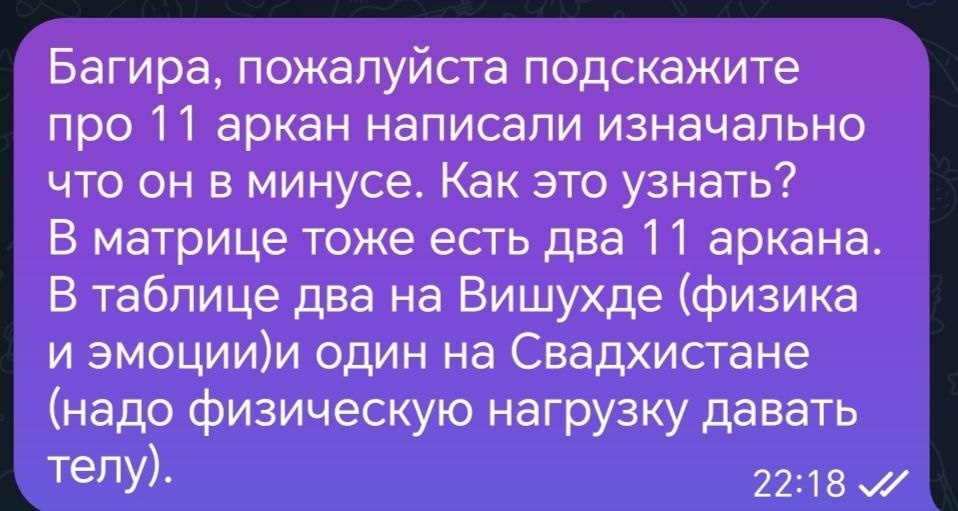 👇 про 11 аркан и «в минусе он или нет». Скажу так. 1️⃣11 аркану ВСЕГДА нужна физическая нагрузка. Неважно, где он стоит. Один 11 аркан на аджне — там нужна уже нагрузка на мозг. ✅Не просто думать, а нагружать себя интеллектуально. И вот здесь важный момент. 🗝Если 11 аркан стоит: 🔸на вишудхе 🔸на свадхистане 🔸в центре матрицы 🔸в кармическом хвосте 🔸 или по линии земли и при этом нет физической нагрузки — он автоматически уходит в минус. Без вариантов. 🎉И как это проявляется? ▫️ раздражение ▫️вспыльчивость ▫️ внутреннее напряжение 🔅ощущение «меня как будто распирает» 🔅 конфликты на ровном месте Теперь про «изначально в минусе». Есть зоны, где арканы идут как карма: 💝правый угол матрицы (материальная карма) 💝и кармический хвост ❗️Вот там действительно нужно максимальное внимание❗️ Не «иногда поделать». А прямо наблюдать за собой. 🟣Теперь самое главное — выводы. Зачем всё это? 🙏Когда 11 аркан проживается в плюс: 💝появляется мощный ресурс энергии 💝тело стан