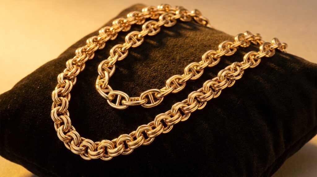 Это главный подвох, о котором многие не знают. Пустотелая цепочка — это технология, при которой золотая проволока внутри полая. Визуально она выглядит массивно, но весит в 2–3 раза меньше полновесного аналога.