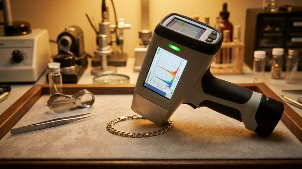 Шаг 2: рентгенофлуоресцентный спектрометр. Прибор показывает точный состав сплава: 58,5% золота, 33,5% серебра, 8% меди — классическая 585 проба. Или 75% золота, 15% серебра, 10% меди — 750 проба. Если результат не совпадает с клеймом — красный флаг.