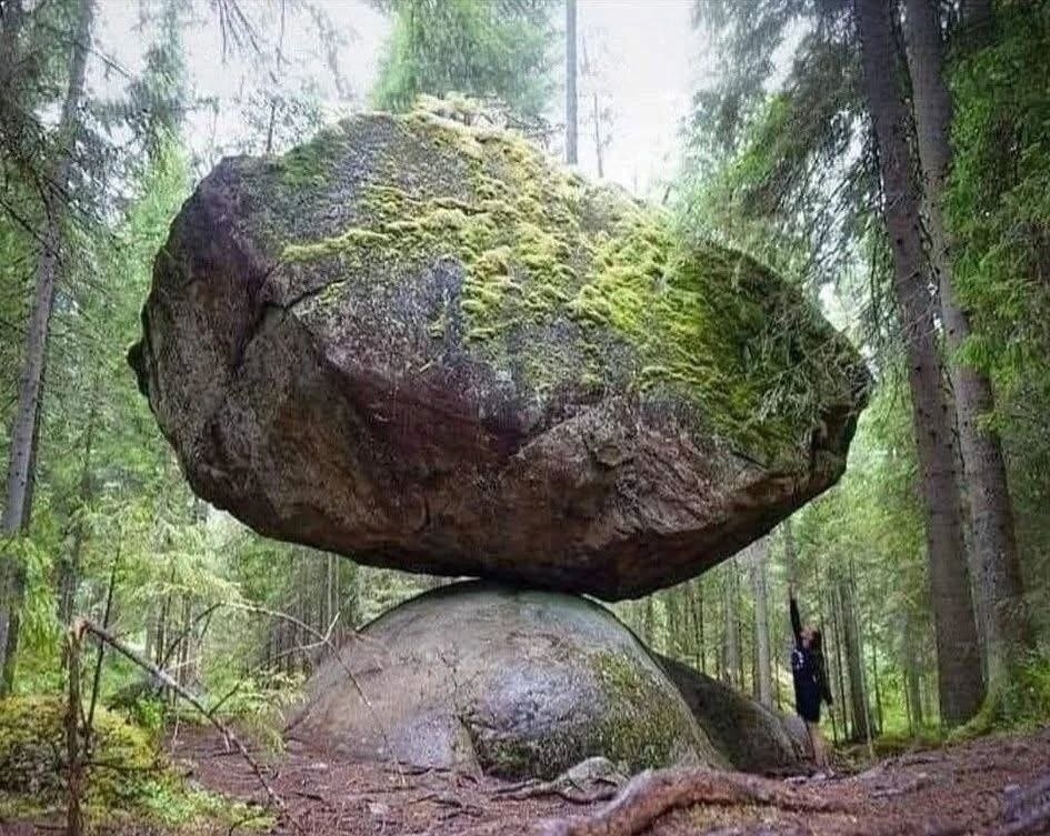 Интересно. В лесах Финляндии находится невероятное природное явление, известное как Куммакиви - массивный 500-тонный валун, находящийся на вершине другого камня. Примечательно, что в этом положении он сохраняется уже много тысяч лет. Его часто называют «странной скалой». Кажется, что он должен упасть в любой момент, но он не падает.
