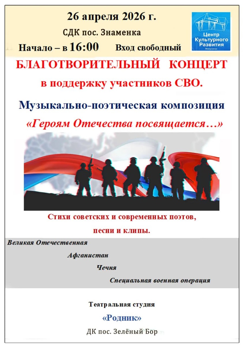 26 апреля в 16.00 в СДК села Знаменка пройдёт благотворительный концерт в поддержку участников СВО