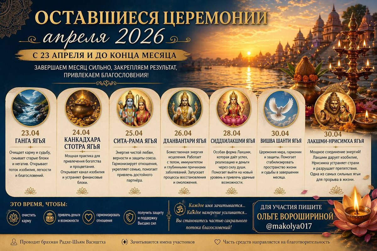 ⚜️ ✨ МОИ ДОРОГИЕ… продолжаем путь апреля — и впереди самые сильные, завершающие церемонии месяца ✨ После мощных процессов очищения, раскрытия и запуска новых энергий — нас ждёт очень глубокий и трансформационный финал апреля 🌿🔥 Это время, когда можно закрепить результат, усилить поток и выйти на новый уровень жизни ➖➖➖ 🌟 ОСТАВШИЕСЯ ЦЕРЕМОНИИ С 23 АПРЕЛЯ: 🔥 23.04 — ГАНГА ЯГЬЯ Энергия священной Ганги — это очищение на уровне души и судьбы 🕊 Она мягко смывает старые программы, страхи, кармические загрязнения. 🌊 Помогает открыть чистый поток изобилия, легкости и благословений 🔥 24.04 — КАНКАДХАРА СТОТРА ЯГЬЯ Одна из самых сильных практик для привлечения богатства 💰 Эта энергия помогает не просто получить деньги, а открыть канал процветания, который удерживается в жизни. 🌟 Особенно сильна при финансовых блоках и страхах 🔥 25.04 — СИТА-РАМА ЯГЬЯ Глубокая энергия чистой любви, верности и защиты союза ❤️ Помогает гармонизировать отношения, исцелить боль, укрепить семью и привл