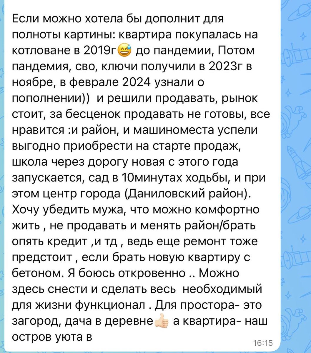 Ждали, мечтали, планировали, район мечты, инфраструктура, школы, садики, друзья- все рядом. А потом состав семьи изменился: +1, кстати это очень часто история, свеженький ребёнок, а старенькие дети сильно выросли и их уже даже в одну комнату не поселить 😅 подростки, понимаешь ли 😵💫 И встает вопрос: что делать с этой квартирой? Под текущая задача она уже не подходит (кажется). Вопрос долго лежит мёртвым грузом, никак не решается, принимается решение квартиру продать, в текущей ситуации квартиры не продается, если продается то сильно ниже рынка и ничего лучше и больше в том месте, где хочется жить уже не купить. Рынок вторички в стагнации. И вот где-то в районе «давай сливать квартиру» приходит мысль, сделать последнюю попытку: взять консультацию у меня. Консультацию по планировке, вдруг что-то получится?! И получилось! Когда я на эту квартиру смотрю, вижу отличные 118м2, в которых у каждого из троих детей получится сделать отдельную, хоть и небольшую, но собственную комнату. У