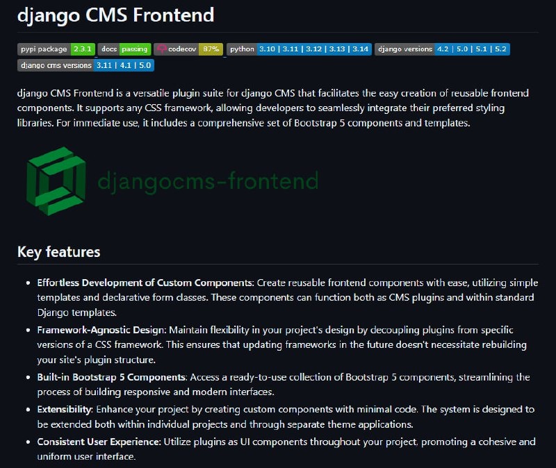 🌐 django CMS Frontend — это набор готовых плагинов для django CMS, который позволяет быстро создавать адаптивные интерфейсы и страницы