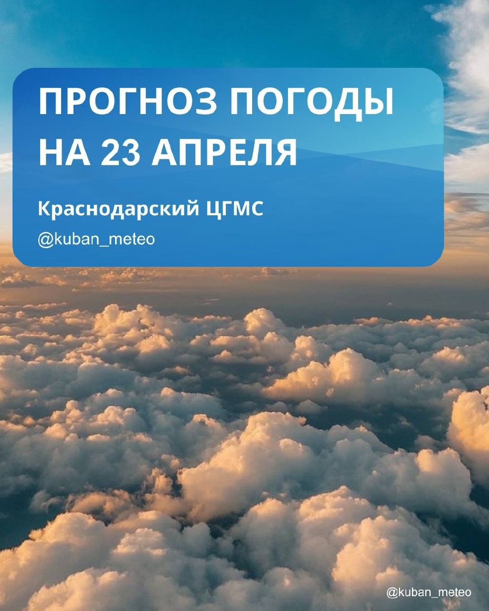 ☁️⛅⛈️ 🌦️Четверг, 23 апреля 📍 Краснодарский край Переменная облачность. Местами дождь небольшой и умеренный, в отдельных районах сильный дождь, в предгорных районах и горах дождь с мокрым снегом. До конца суток 22.04.2026 и ночью 23.04.2026 местами в южной и восточной половинах края сильный дождь, в предгорных районах сильный дождь со снегом, ливень в сочетании с грозой, градом и сильным ветром с порывами 20 м/с (КМЯ). 💨 Ветер западный, юго-западный 5–10 м/с, днём местами порывы 15–18 м/с. 🌡 Температура воздуха: ночью 0…+5°, местами на Азовском побережье 3…8°; во второй половине ночи и утром местами ожидаются заморозки в воздухе и на поверхности почвы −1…−3° (ОЯ); днём 9…14°; 🏔 в горах ночью −1…−6°, днём −1…+4°; 🌊 на Черноморском побережье ночью 3…8°, днём 10…15°. 📍 По г. Краснодару Переменная облачность. Без осадков. 💨 Ветер западный, юго-западный 5–10 м/с, вечером 23.04 порывы 12–14 м/с. 🌡 Температура воздуха ночью 2…4°, днём 12…14°. С заботой, Краснодарский ЦГМС @kuban_