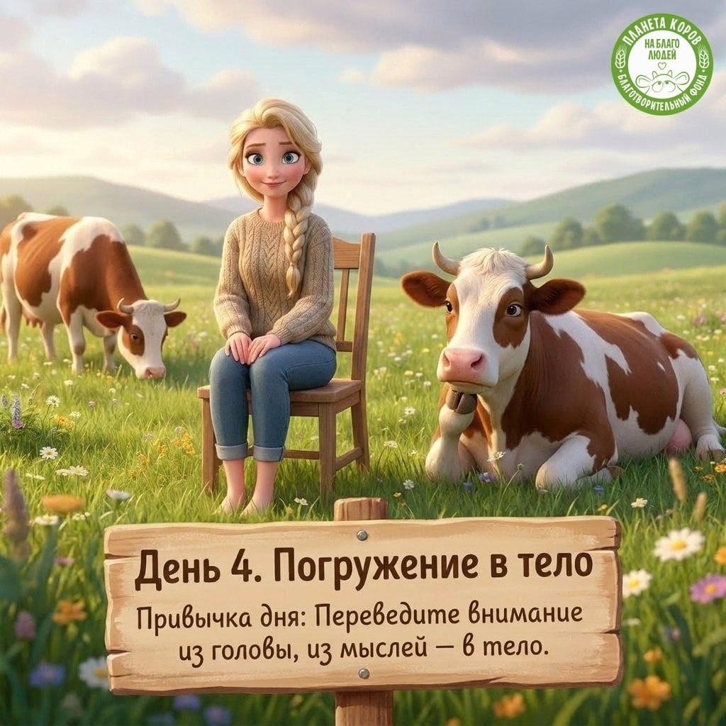 Марафон "Привычки от коров." День 4. Погружение в тело 🐮 Корова всегда чувствует своё тело. Она знает, где у неё напряжён бок, где чешется ухо, где приятно дует ветер. Вы можете так же — вернуться вниманием в тело, в свой внутренний мир. 🙏🏻 Привычка дня: выделите минуту. Сядьте удобно или встаньте. Закройте глаза (или прикройте). Переведите внимание из головы, из мыслей — в тело. 💓 Практика: просто побудьте внутри себя. Почувствуйте, где тело касается стула или пола. Где есть тепло или лёгкая прохлада. Где есть приятное расслабление, а где — небольшое напряжение, которое можно мягко отпустить. Не нужно ничего менять. Просто замечать. Это и есть возвращение в свой внутренний мир.