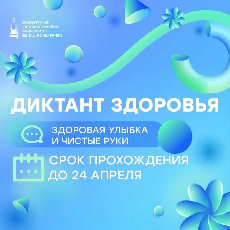 » 🙂 Студенты и сотрудники ОГУ имени В. А. Бондаренко приглашаются к участию в первом этапе Всероссийской акции «Диктант здоровья» – «Здоровая улыбка и чистые руки». Участники узнают, почему важно чистить зубы, что полезно и вредно для эмали, как здоровье зубов влияет на организм, а также когда и как правильно мыть руки ✨ «Диктант здоровья» можно пройти до 24 апреля в удобном онлайн-формате на официальном портале акции по ссылке: диктант-санпросвет.рф/ После внесения ответов каждый сможет увидеть результаты и подробные пояснения экспертов. Все участники получат электронные сертификаты 👍 🇷🇺 Мы в МАКС #ОГУ #в_ОГУ #OSU