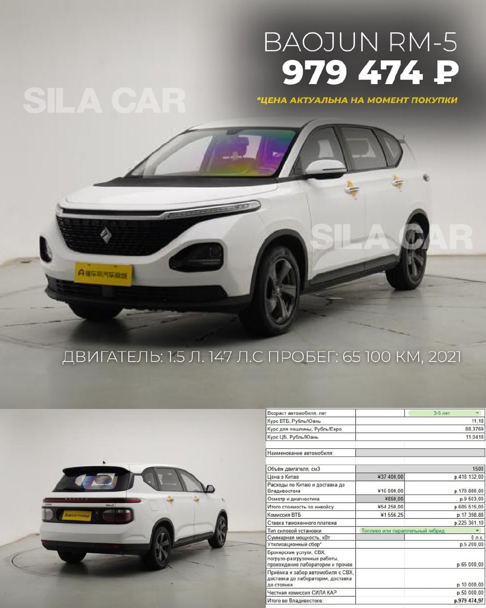 Baojun RM-5 📍Год: 2021 📍Двигатель: 1.5л / 147 л.с. / вариатор / FWD 📍Пробег: 65 100 км 📍Комплектация: Elite 6-Seater 📍Под ключ: 979 474₽ 📍Или в кредит от 18.013₽ в месяц Citroen Berlingo 📍Год: 2022 📍Двигатель: 1.5л / 130 л.с. / АКПП / FWD 📍Пробег: 60 000 км 📍Комплектация: Shine 📍Под ключ: 1 250 549₽ 📍Или в кредит от 22.999₽ в месяц Volkswagen Touran L 📍Год: 2017 📍Двигатель: 1.4л / 150 л.с. / робот / FWD 📍Пробег: 45 000 км 📍Комплектация: Comfort Edition 7-seater 280TSI 📍Под ключ: 1 541 330₽ 📍Или в кредит от 28.346₽ в месяц Baojun 730 📍Год: 2021 📍Двигатель: 1.5л / 147 л.с. / вариатор / FWD 📍Пробег: 47 300 км 📍Комплектация: Fashion 7-seater 📍Под ключ: 1 260 204₽ 📍Или в кредит от 23.176₽ в месяц Citroen C4 Picasso 📍Год: 2015 📍Двигатель: 2.0л / 150 л.с. / дизель / АКПП / FWD 📍Пробег: 79 000 км 📍Комплектация: B-HDI Intensive 📍Под ключ: 1 622 428₽ 📍Или в кредит от 29.838₽ в месяц Chevrolet Orlando 📍Год: 2015 📍Двигатель: 1.6л / 134 л.с. / дизель / АКПП /