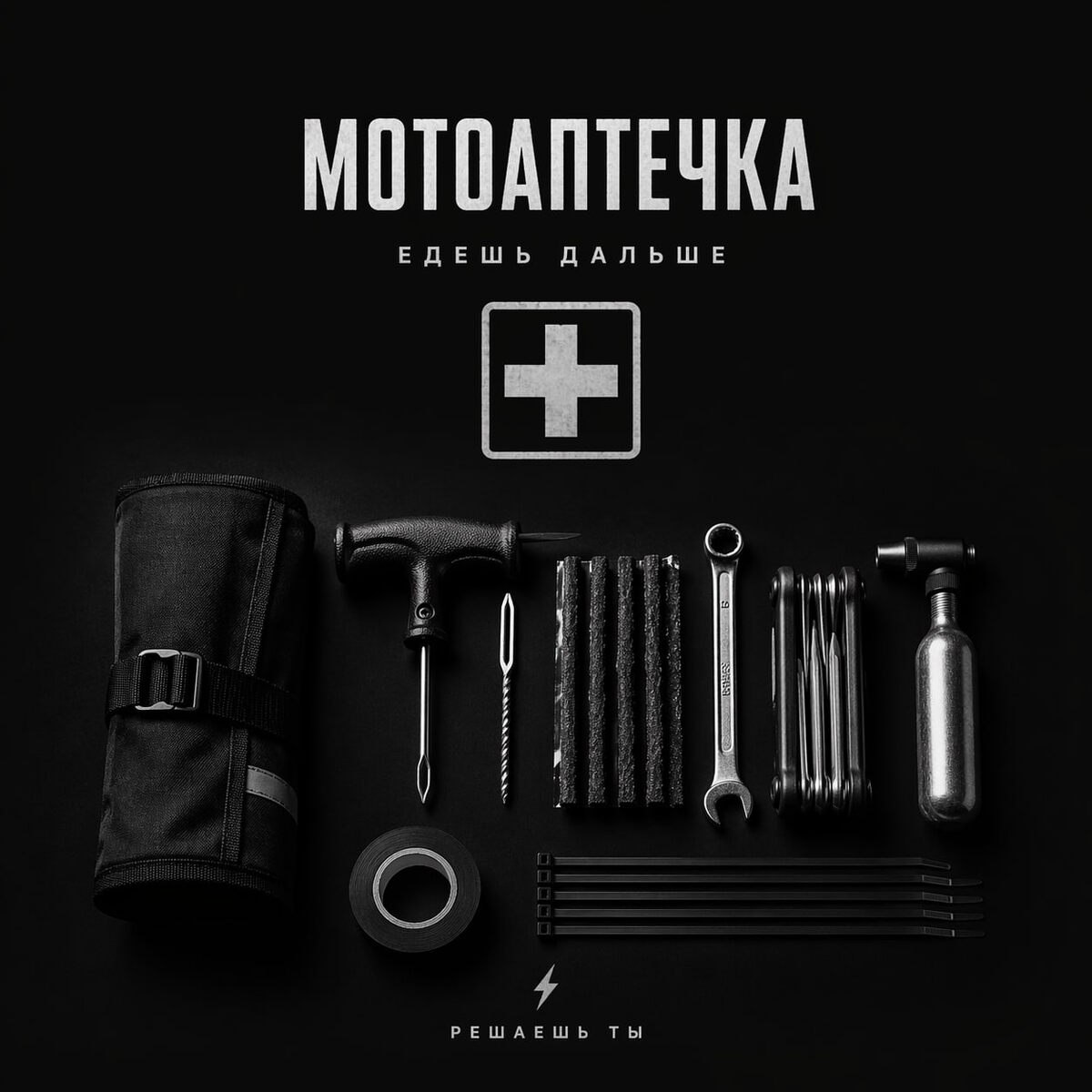 »? Прокол колеса. Ослаб болт. Слетел трос. И ты уже не райдер, а пешеход с мотоциклом. 👉 Мотоаптечка — это не «на всякий случай». Это твоя возможность уехать своим ходом. 🔧 Минимальный набор: — набор для ремонта шин (жгуты + инструмент) — мини-компрессор или CO₂-баллон — мультитул или базовые ключи — шестигранники под твой мотоцикл — изолента — стяжки (они же «спасут всё») ⚙️ Чуть продвинутый уровень: — свечной ключ — запасные предохранители — кусок провода — маленький фонарик — перчатки 💡 Факт: 90% мелких проблем на дороге можно решить на месте. Если у тебя есть чем. 😏 А теперь честно: у тебя есть мотоаптечка или ты из секты «главное — чтобы не ломалось»? )