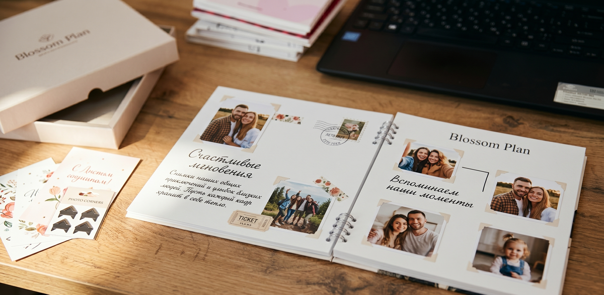 Елена на связи. Я редактор Blossom Plan, и через мои руки прошли сотни фотоальбомов — от дешевых поделок до премиальных вариантов. И знаете, что самое обидное? Когда дарят красивую коробку, а внутри — тонкие просвечивающие листы и хлипкий переплет. Вот вам простой тест: возьмите любой маркер и проведите линию на странице альбома. Если с обратной стороны видно след — это не наш вариант. Вы же знаете эти чувства: - Купили альбом, а фото выпадают через месяц. - Хочется что-то подписать, но ручка растекается. - Обложка выглядит как из 2000-х — с блестками и кричащими надписями. Особенно грустно, когда такой альбом — подарок. Человек вроде старался, но результат... 1. Бумага плотностью 250 г/м² — не просвечивает даже под спиртовыми маркерами. 2. Квадратный формат 21×21 см — удобно листать, помещается в большинство полок. 3. Обложка из ПВХ — не боится кофе, пыли и детских рук. 4. Никаких навязанных шаблонов — только чистые листы и ваши идеи. Кстати, о детях. Наши альбомы часто берут мамы — ч