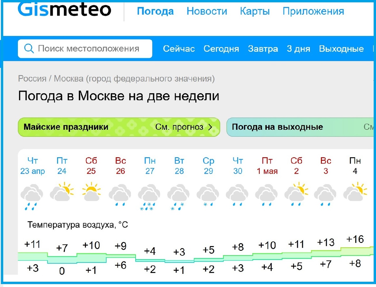 После теплого и солнечного марта в Москве наступил холодный и дождливый апрель. Судя по прогнозам синоптиков, тепло к нам все-таки придет, но не сразу. А на первые майские праздники обещают дожди.