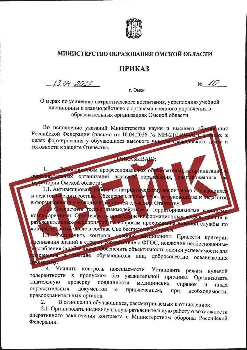 разъяснительные беседы «по вопросам прохождения военной службы по контракту, в том числе в составе Сил беспилотных систем». Также в документе говорится о необходимости организовать со студентами, которым грозит отчисление, «разъяснительную работу о возможности оперативного заключение контракта в министерством обороны». В региональном минобре, от имени которого рассылаются документ, заявили, что это фейк. Такого нормативного документа нет, - сообщила глава министерства Ольга Степанова. Новости Омска в Макс. Подписаться