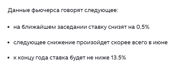 Перед предыдущим заседанием совета директоров: ROISFIX предсказывал, что: Совет директоров тогда снизил ставку в соответствии с предсказаниями. Посмотрим, как за прошедшее время вели себя факторы, на которые опирается Банк России в принятии решений о ставках. Месячная инфляция постепенно замедлялась после резкого скачка в январе. В марте текущего года инфляция была ниже, чем год назад, но выше, чем в 2024 и 2023 годах Но за последние две недели апреля недельная инфляция показала резкое замедление: Инфляционные ожидания: В апреле они замедлились до 12.9% после роста в марте В феврале кредит умеренно вырос после сезонного снижения в январе. После ослабления в первой половине марта в связи приостановкой бюджетного правила, рубль перешел к росту из-за начала поступления в страну валюты от резко подорожавшей нефти. В настоящее время большинство аналитиков предсказывают снижение ставки на 0.5%. Посмотрим, что же показывает срочный рынок: Данные ROISFIX на 23.04.2026 Изменения в сравнении с
