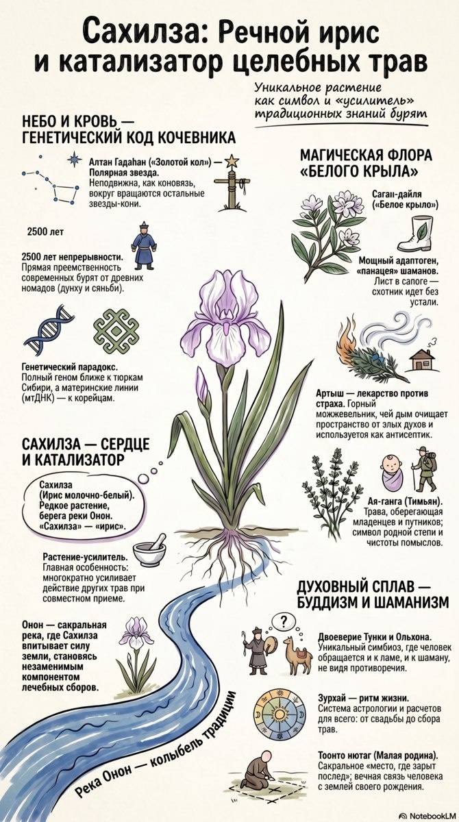 Сахилза — бурятское название ириса молочно-белого (Iris lactea), редкого растения берегов реки Онон. В бурятской традиционной медицине ирис ценится прежде всего как «растение-усилитель»: при совместном приёме он многократно усиливает действие других трав, что делает его незаменимым компонентом сложных лечебных сборов. Сахильная роль реки Онон неслучайна: именно здесь, согласно «Сокровенному сказанию монголов», зарождался мир Чингисхана. Вода и корни ириса впитывают «силу земли». Инфографика объединяет несколько растений «белого крыла»: саган-дайля (адаптоген шаманов), артыш-можжевельник (очищение пространства) и ая-ганга (оберег путников). Зурхай — астрологическая система — регулирует даже время сбора этих трав. 📖 Источники: Асеева Т.А., Дашиев Д.Б. «Тибетская медицина» (Улан-Удэ, 1991); данные ИМБТ СО РАН