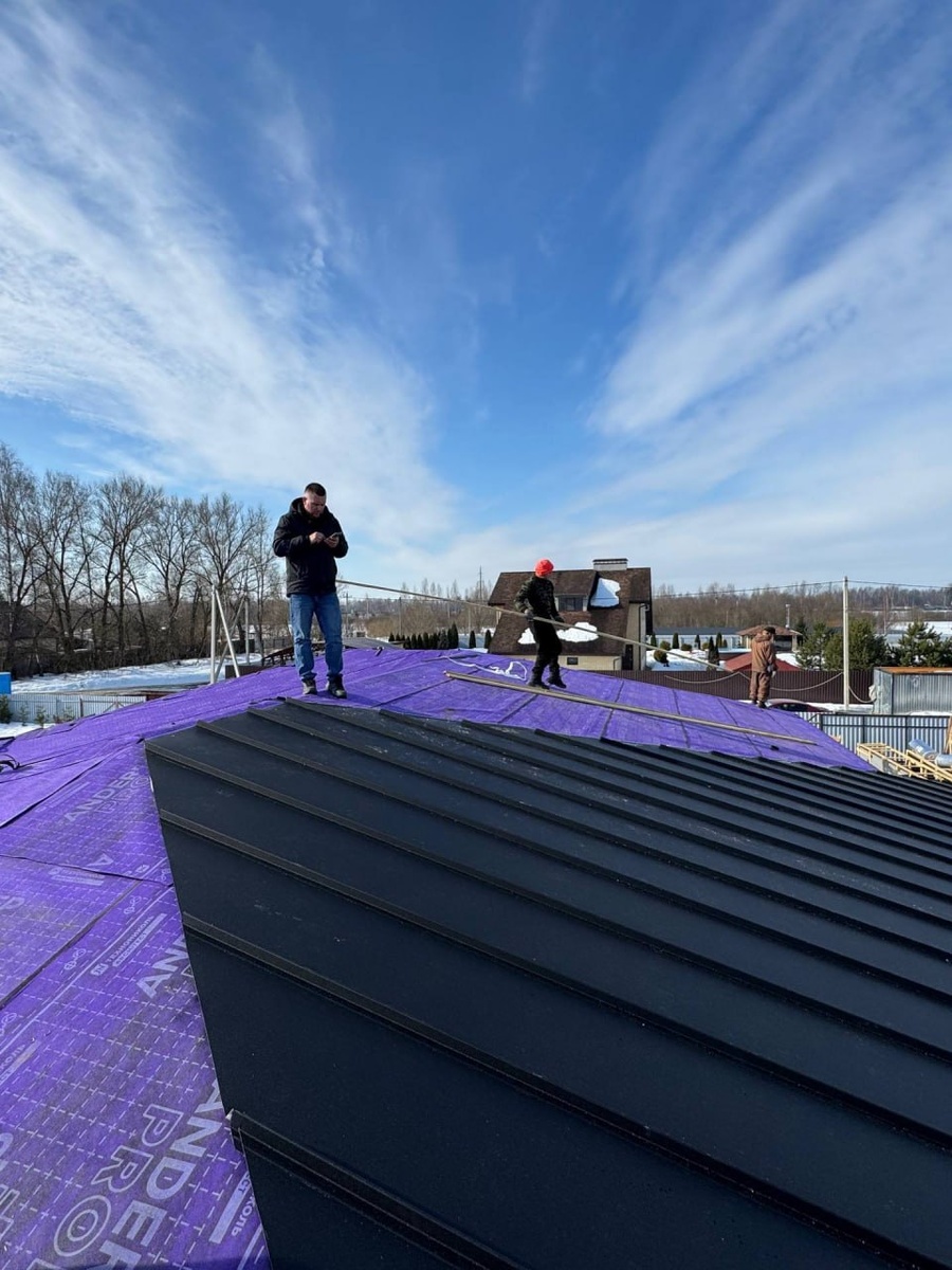 На фото — подготовка основания: укладка подкладочного ковра перед монтажом металла. Он берёт на себя влагу, защищает конструкцию и даёт дополнительную герметичность. Дальше уже идёт монтаж кликфальца. Кликфальц — это металлическая кровля, где листы соединяются между собой самозащелкивающимся замком без сложного инструмента. За счёт этого монтаж идёт быстрее, а стыки получаются герметичными и аккуратными. В итоге — ровная крыша с чёткими линиями, без лишнего крепежа и с хорошей защитой от протечек. Если планируете строительство дома — напишите нам в личные сообщения, подберём оптимальное решение под ваш проект 📩