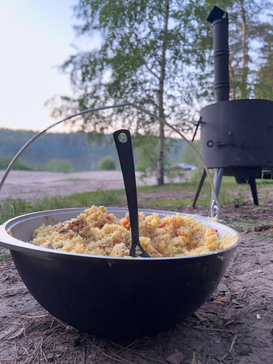Тёплый день, свежий воздух, треск костра — и вот уже по поляне разносится аппетитный аромат. Каждый выход на природу словно открывает новую главу кулинарной книги: рассыпчатая каша, уха с лёгким дымным привкусом, сочное мясо, поджаренные колбаски, запечённые овощи, травяной чай… Блюда, приготовленные под открытым небом, будто обретают особый вкус — тот самый, что запоминается надолго и зовёт в новые походы. Но чтобы воплотить свои кулинарные фантазии, нужно подобрать верную спутницу — посуду, которая не подведёт у костра. Лёгкие походные алюминиевые казаны и котлы удобно перевозить: они почти не добавляют веса рюкзаку. А если установить их на треногу над огнём, процесс становится ещё проще — вы можете наслаждаться моментом, изредка помешивая готовящееся блюдо и вдыхая ароматы природы. А вот для долгих посиделок у костра и основательной готовки подойдёт чугунный казан. Он словно создан для того, чтобы томить блюда часами: толстые стенки и дно держат тепло, пища готовится медленно и равн
