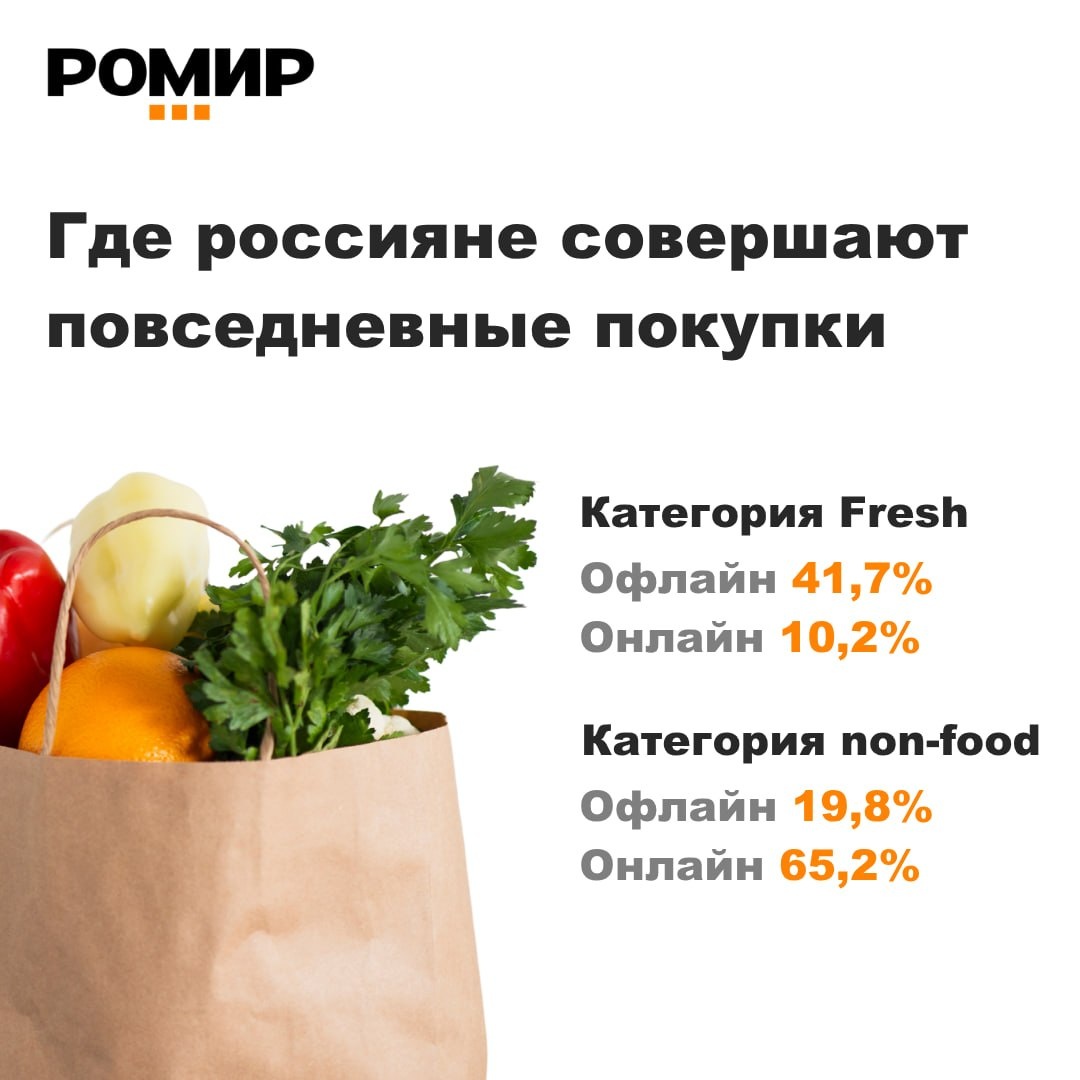 Россияне предпочитают покупать продукты категории Fresh в магазинах. Готовые блюда, овощи и фрукты, молоко, мясо, рыба, зелень и выпечка занимают 41,7% офлайн-корзины. Непродовольственные товары, наоборот, активнее приобретают через интернет-сервисы – 65,2%. «Потребитель сегодня мыслит не каналами, а задачами. Там, где важны скорость и удобство, он выбирает онлайн. Там, где требуется визуальная оценка, ощущение свежести и доверие к качеству, сохраняется приоритет офлайн-магазина. Именно поэтому будущее ритейла связано не с конкуренцией каналов, а с их грамотным сочетанием», – отметила руководитель отдела РОМИР Екатерина Тимошевская. Продукты длительного хранения востребованы в обоих форматах: 38,4% в офлайн-покупках и 24,6% в онлайн-заказах. Эти и другие данные были представлены на научно-практической конференции РОМИР «Мир человека». Подробнее с результатами исследований и материалами выступлений можно ознакомиться на сайте в разделе «Готовая аналитика». Подписывайтесь на РОМИР Чи